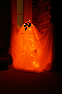 My daughter is 3. We are having her birthday party on Saturday, so I am busy getting the house decorated, cleaned, and ready for the party. I saw this idea in the Family Fun magazine and decided that I just needed to do it! I salvaged 2 discarded tomato cages from my parents, bought strands of orange lights and a small sheet of black Fun Foam, scrounged around for 2 old sheets I could use and went to town! What in the world did I create? THESE!